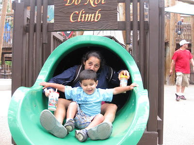 maniacally! The giant multi tiered wooden play structure with rope climbs, catwalks, and slides is a little boy's dream. The slide at the highest point of the structure is the best way for big people to get down without getting stuck in the ropes. The twenty foot drop is ridiculously steep. Well, Son2 climbed his way to the top of the structure twice. Hubs and I each had the opportunity to follow him through the slide tube. Can you see the look in my eyes of recovery?